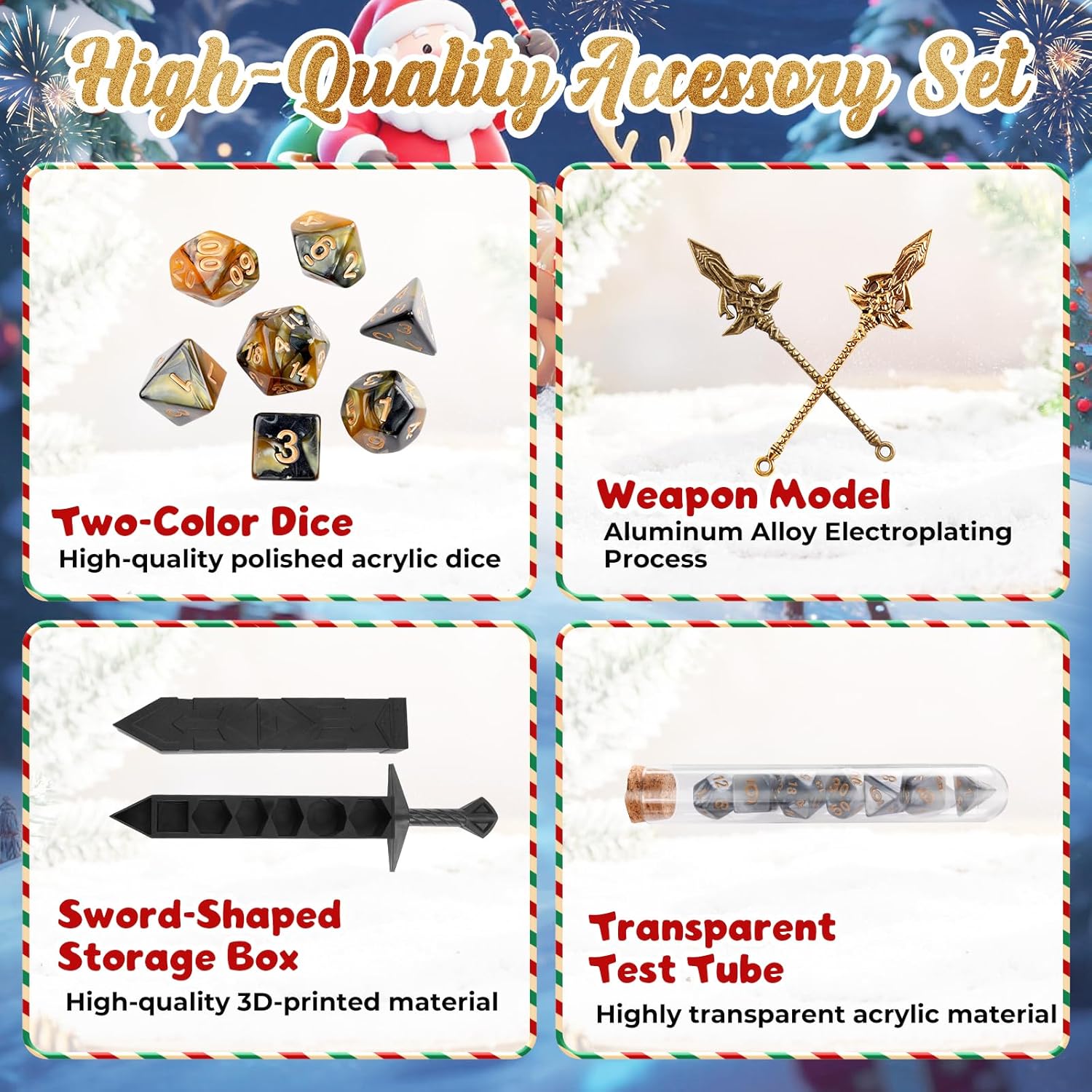 - 24-Tage-Countdown: Dieser Adventskalender bietet einen spannenden 24-Tage-Countdown mit einer Sammlung von 28 polyedrischen Würfeln, 2 dekorativen Schwertern, einer schwertförmigen Aufbewahrungsbox und einem Glasröhrchen – ein Muss für jeden Sammler.
